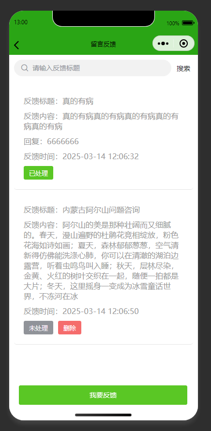 留言反馈管理 展示留言反馈列表,包含反馈标题、内容、回复、时间及处理状态;支持删除反馈、发起新反馈操作;提供反馈标题搜索功能