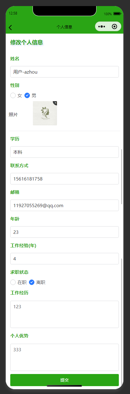 修改个人信息 提供姓名、性别、照片、学历、联系方式等个人信息的编辑与提交功能