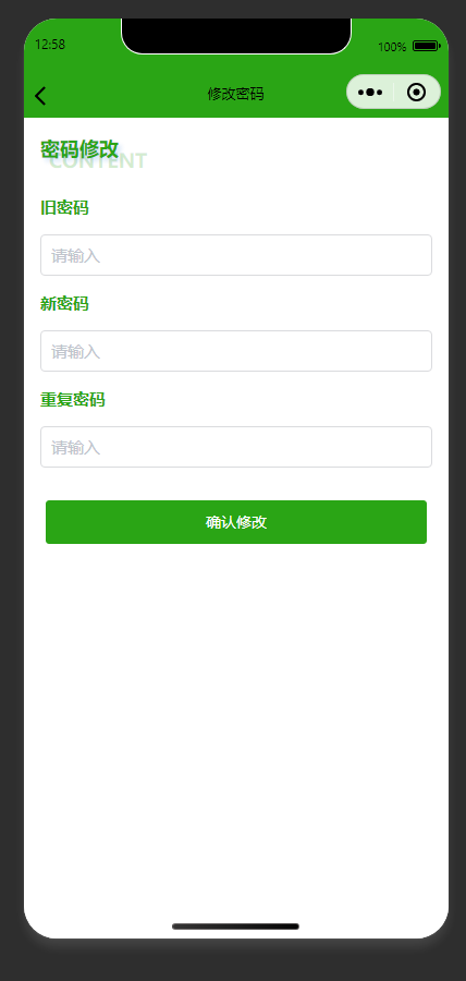 密码修改 接收用户输入的旧密码、新密码及重复新密码,点击确认后执行密码修改操作