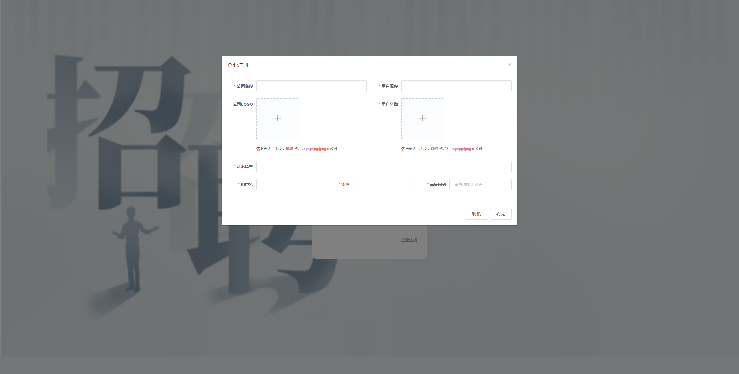 企业注册 收集企业注册所需的公司名称、用户昵称、公司LOGO、用户头像、基本信息、用户名、密码等信息,支持上传指定格式和大小的图片,提供取消和确定操作以完成或放弃注册流程