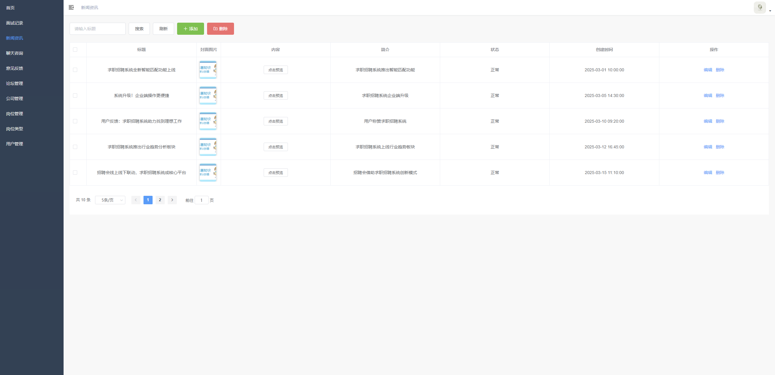 新闻资讯管理 实现新闻资讯的查询、新增、删除、编辑及分页浏览,展示新闻标题、封面图片、内容预览、简介、状态、创建时间等信息,支持批量删除操作