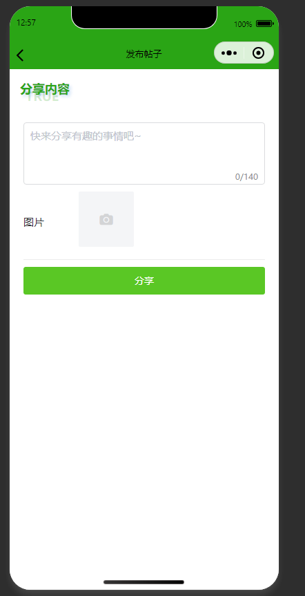 发布帖子 用户输入文本内容(140字限制)、上传图片后,点击分享按钮发布内容