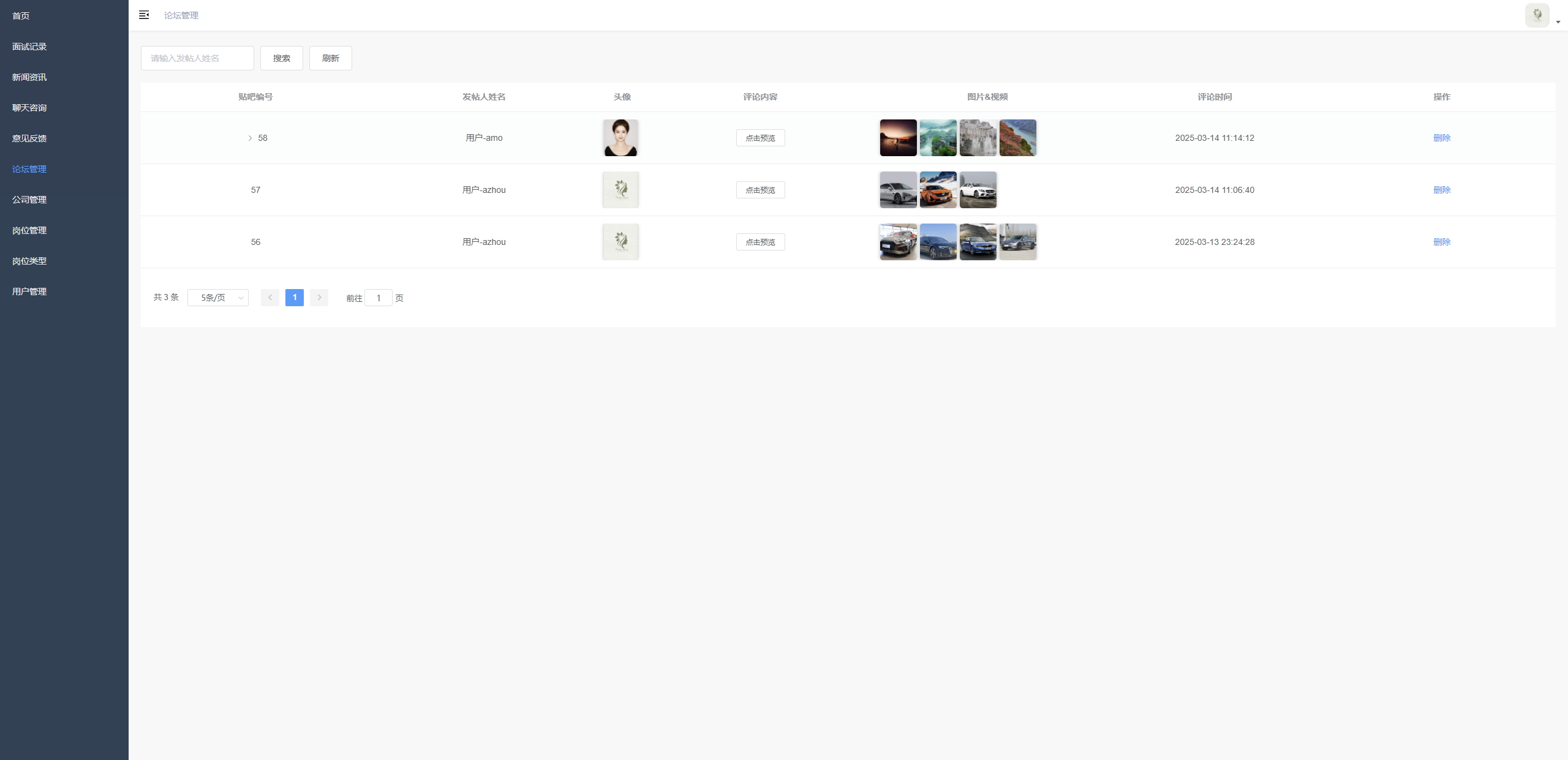 论坛帖子管理 支持按发帖人姓名搜索、刷新论坛帖子列表,查看帖子的贴吧编号、发帖人姓名、头像、评论内容预览、图片&视频、评论时间等信息,并对帖子执行删除操作,同时提供分页浏览功能