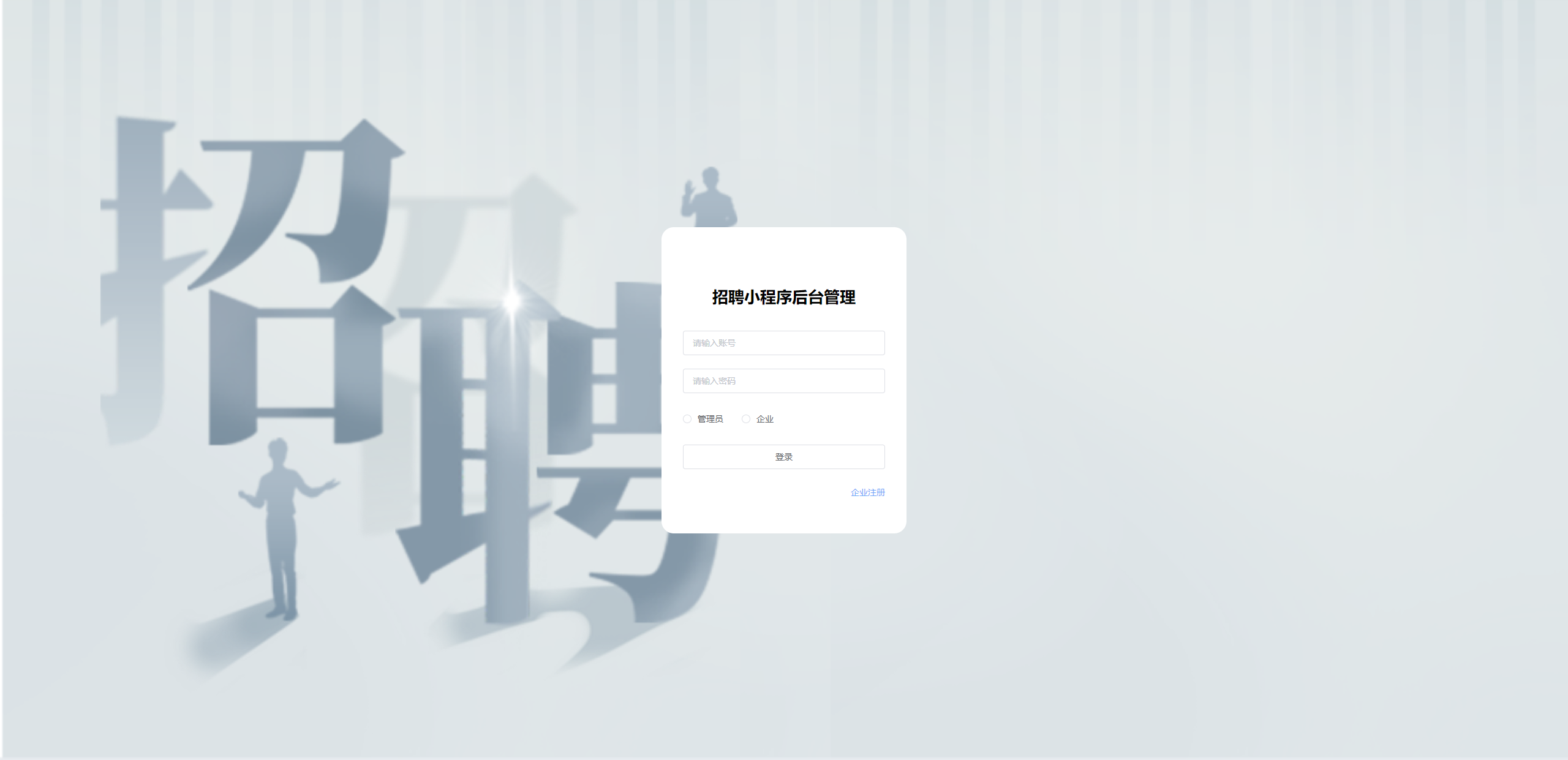 用户身份验证与登录入口 提供账号、密码输入及身份选择(管理员/企业),完成登录操作以进入招聘小程序后台管理系统