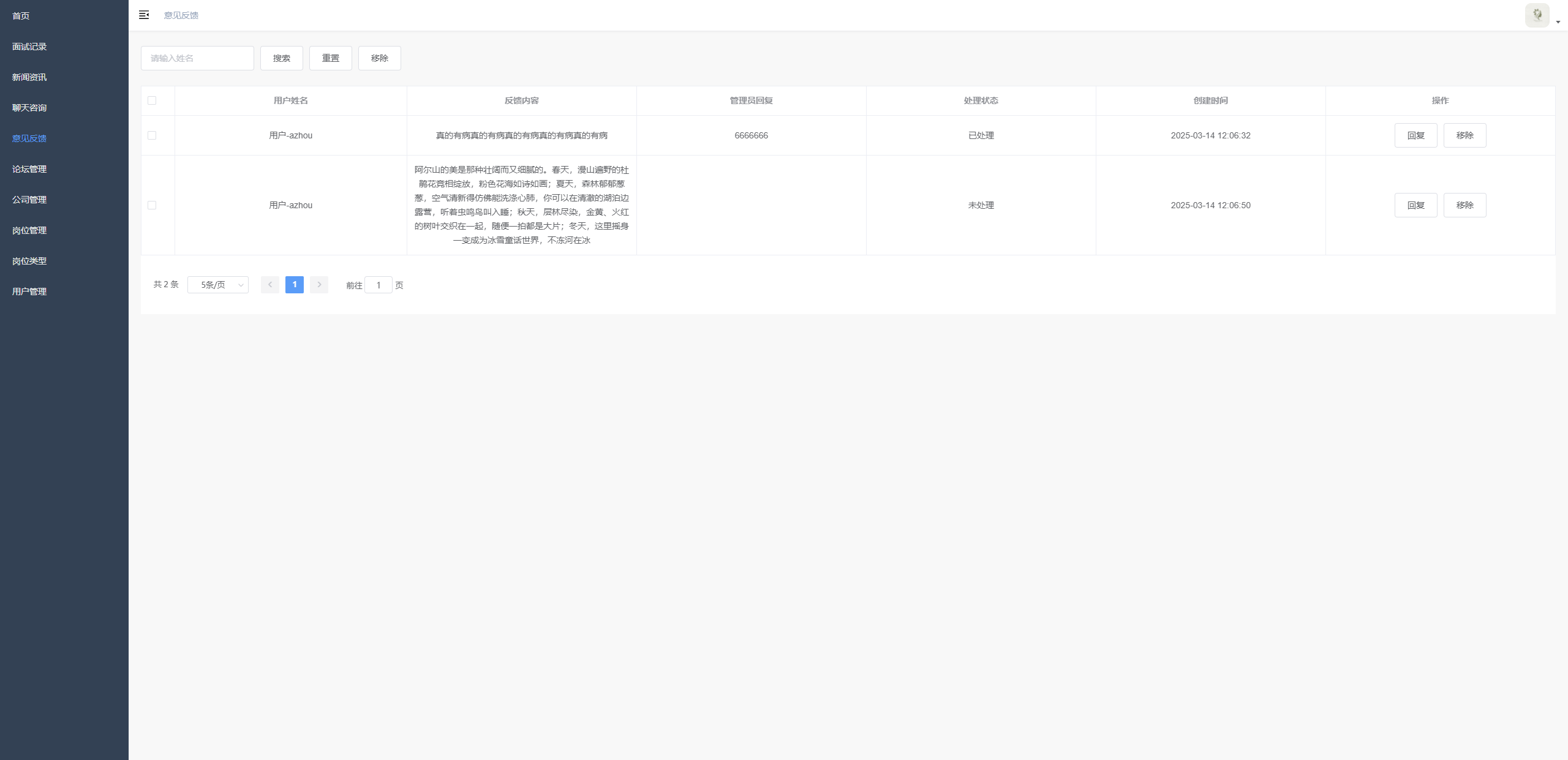 用户反馈管理 支持查看用户反馈记录,按用户姓名搜索反馈,重置搜索条件,移除反馈,对反馈进行回复操作,支持分页浏览反馈数据
