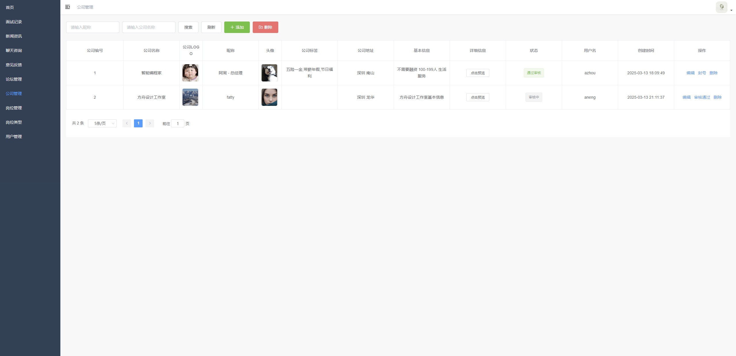公司信息管理 提供公司信息的查询、新增、删除、编辑、审核等管理功能,展示公司基本信息及状态