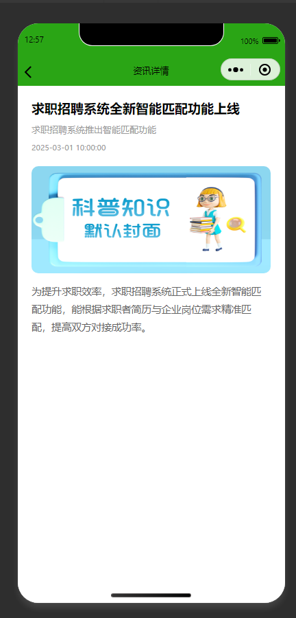 展示求职招聘系统功能上线的资讯详情 呈现求职招聘系统全新智能匹配功能上线的通知,说明该功能可提升求职效率、精准匹配简历与岗位需求