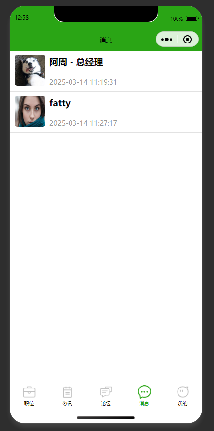 消息列表展示 展示消息相关的联系人或消息项,包含联系人头像、名称及时间信息