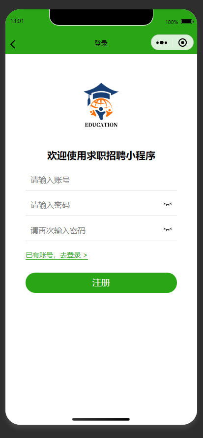 用户注册 支持新用户输入账号、密码(两次)完成注册,提供已有账号跳转登录的入口
