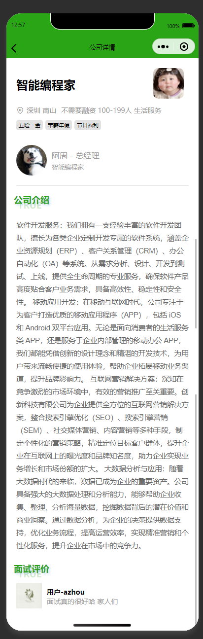 展示公司详细信息 呈现公司的基本信息(名称、位置、规模等)、业务范围、高管信息及面试评价等内容