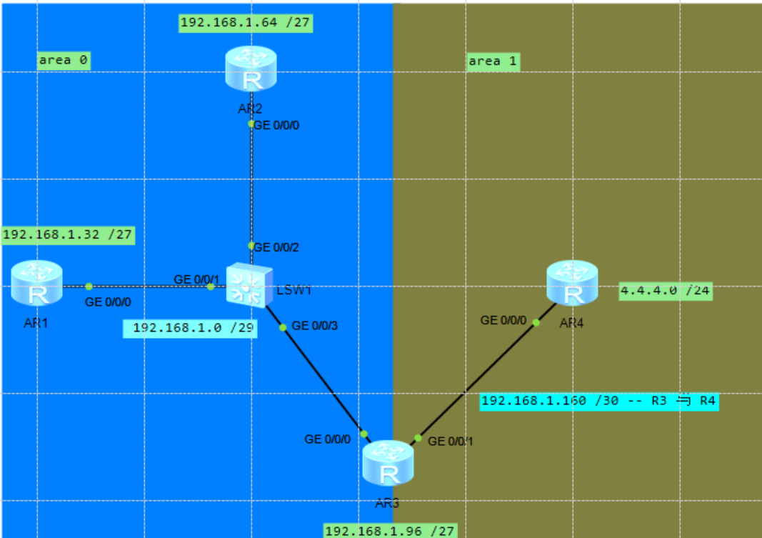1.实验是基于192.168.1.0 /24 进行划分,且有区域0和区域1,因此我们借一位网络位,划分出192.168.1.0 /25 和 192.168.1.128 /25,作为两个区域的汇总。