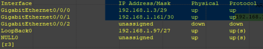 [r1-GigabitEthernet0/0/0]ip address 192.168.1.1 29