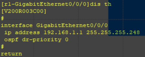 [r1-GigabitEthernet0/0/0]ospf dr-priority 0