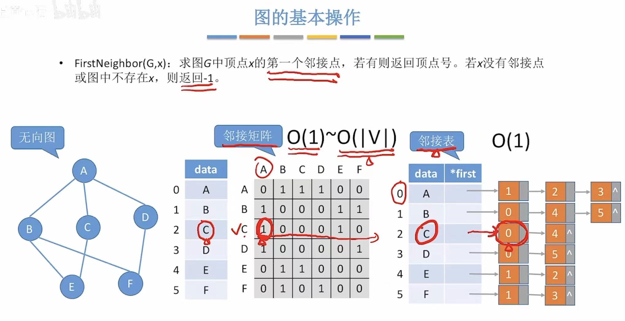 - FirstNeighbor就可以以2为中心,找这个顶点的第一个邻接点-->1