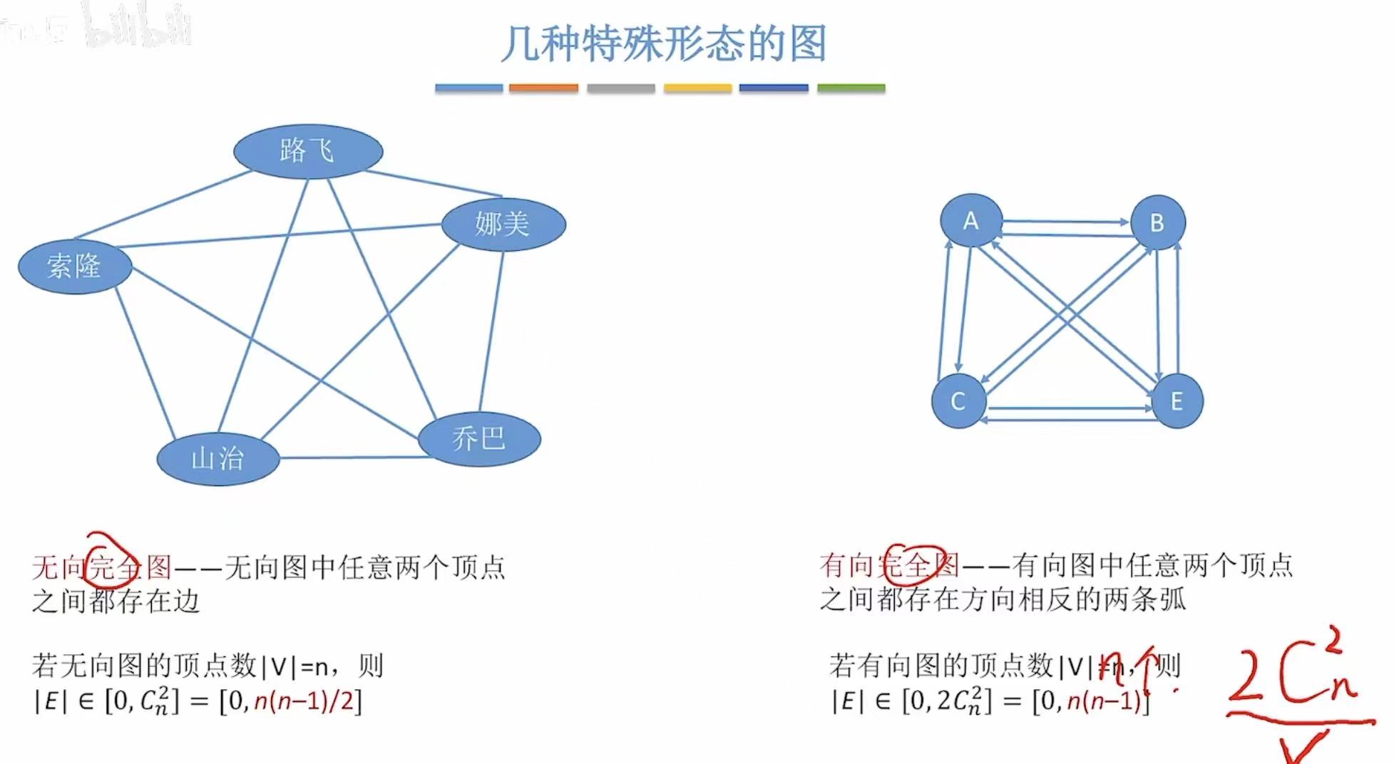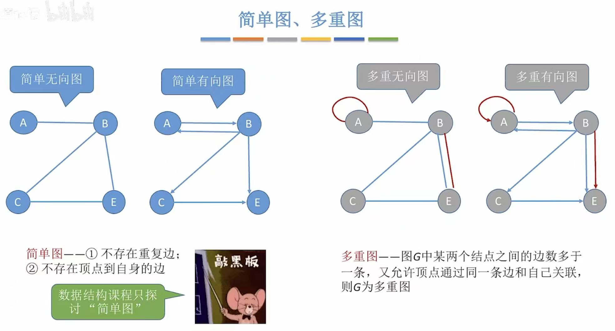 - 简单图:不存在重复边、不存在顶点到自身的边。
