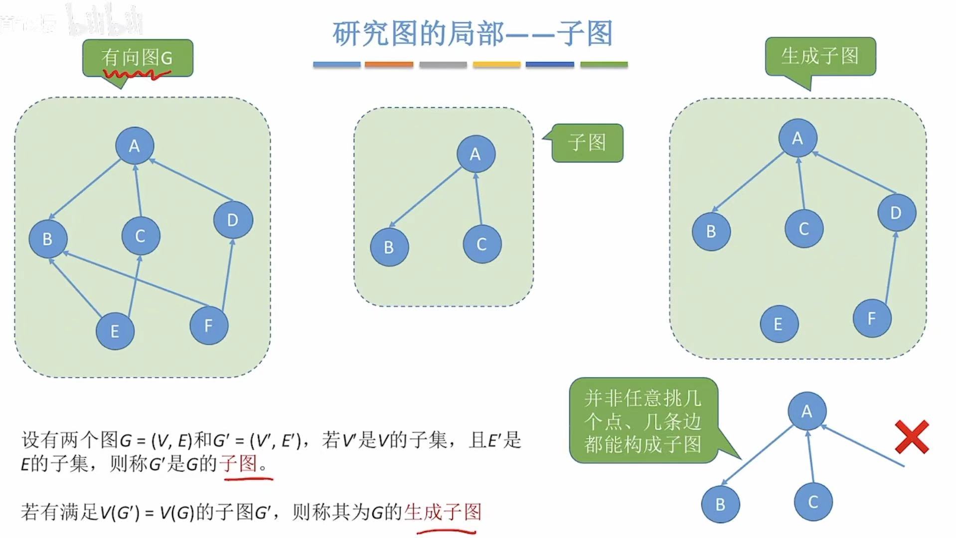 子图 :从整体图上拆下来的图。老规矩,可以没边但是不能没顶点。