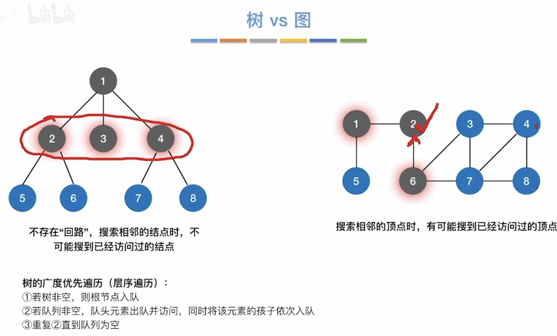区别 :遍历的过程中,树不可能有访问过的结点,而图可能会有访问过的顶点。