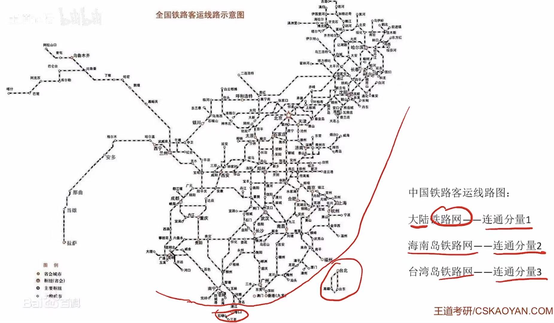- 海南岛和台湾岛内部的顶点也是全部连通的,所以这是两个连通分量。