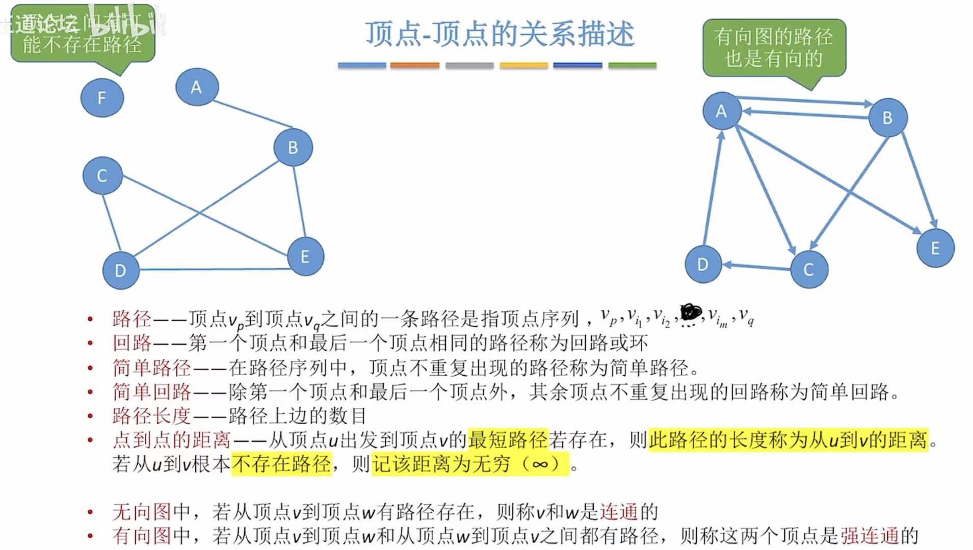 - 路径:比如C到E的路径-->CE、CDE、CDBE