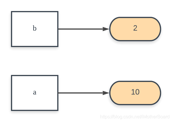 在python中,各个对象(如整数10、列表[1,2])都是被单独创建在堆内存 中的,而我们作为程序员书写的变量名a或b只是贴在这些对象上的标签 ,或者说是指向这些对象的指针
