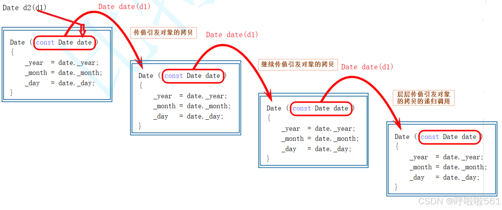 拷贝构造的拷贝:一个已经存在的对象去初始化另一个对象