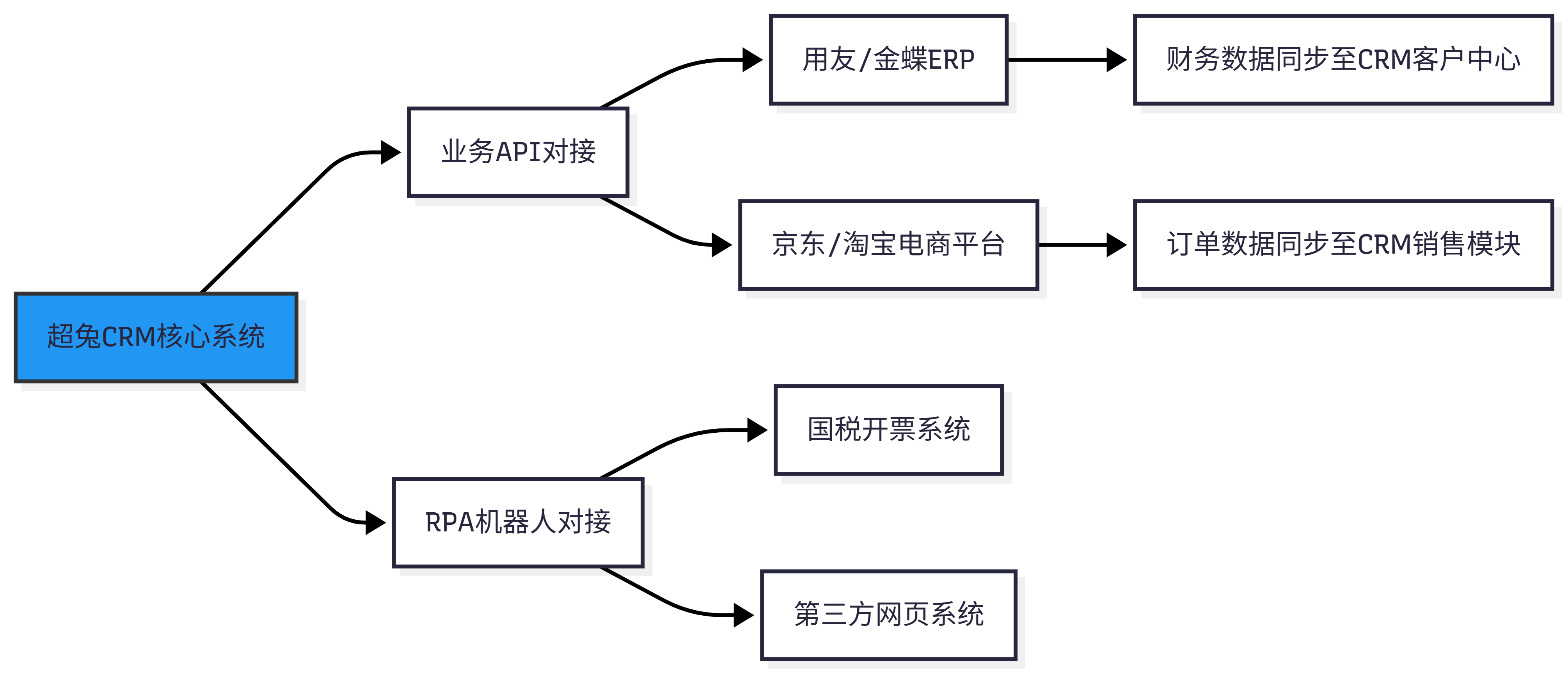 | SugarCRM | ERP/电商系统标准化API | 开源架构(Sugar Studio) | 通用企业系统对接 | 需集成第三方RPA |