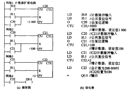 程序使用了三个计数器(C20, C21, C22)进行两级扩展,来实现 1000 * 100 * 2 = 200,000 的计数。