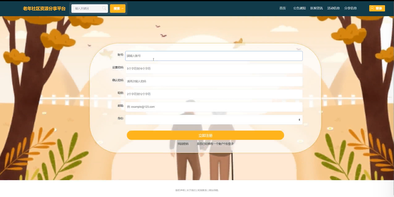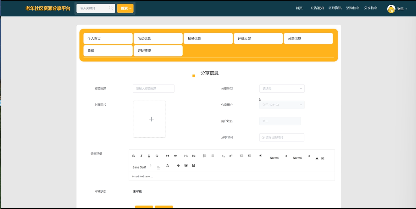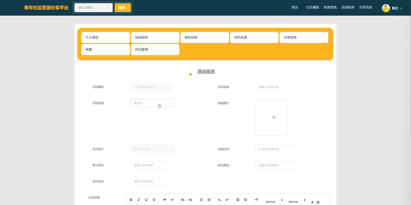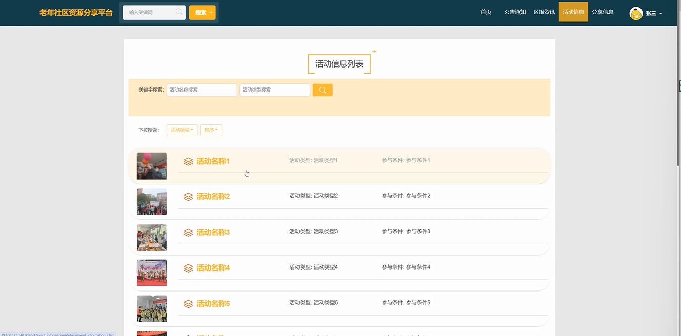 随着社会老龄化的加剧,老年人群体的生活需求日益增加,尤其是在社区活动和资源分享方面。设计并实现一个易于适应的老年生活动资源分享平台,帮助老人们更好的参与活动。通过平台实现老人们的资源共享与信息的交流,鼓励他们积极参与社区活动。通过丰富的活动和资源,提高老人们的生活质量,增强他们的幸福感和归属感。老年人不仅需要基本的生活照料,还渴望参与到社会活动中,以保持身心健康,增强社会归属感。通过丰富多样的活动,老年人可以建立社交联系,提升生活满意度。