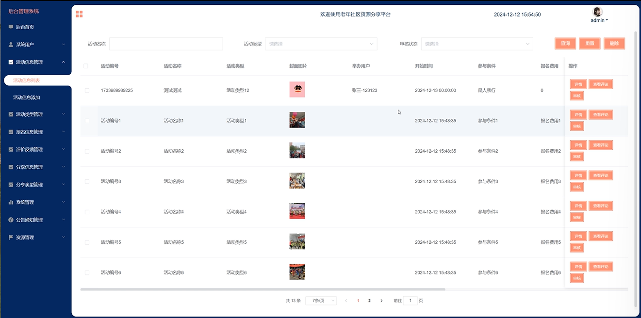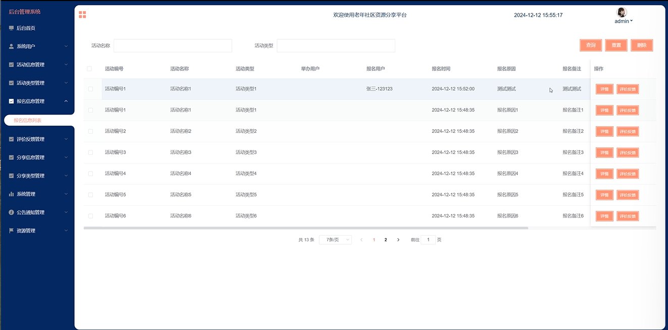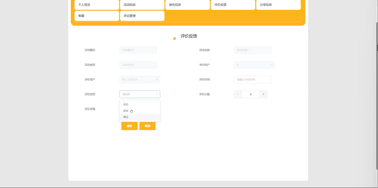 评价反馈管理:管理员可以查看用户对活动的评价和反馈,及时处理用户的问题和建议,提升服务质量。