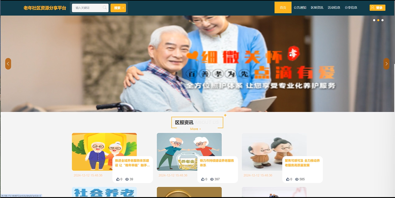 通过系统的实现,老年用户能够方便地获取社区动态、参与各类活动、发布分享信息,从而形成一个良好的互动环境。管理员则能够通过系统高效地处理各类事务,提高社区管理的效率和服务质量。该平台不仅为老年人提供了一个信息交流和资源共享的渠道,也为社区的可持续发展奠定了基础。