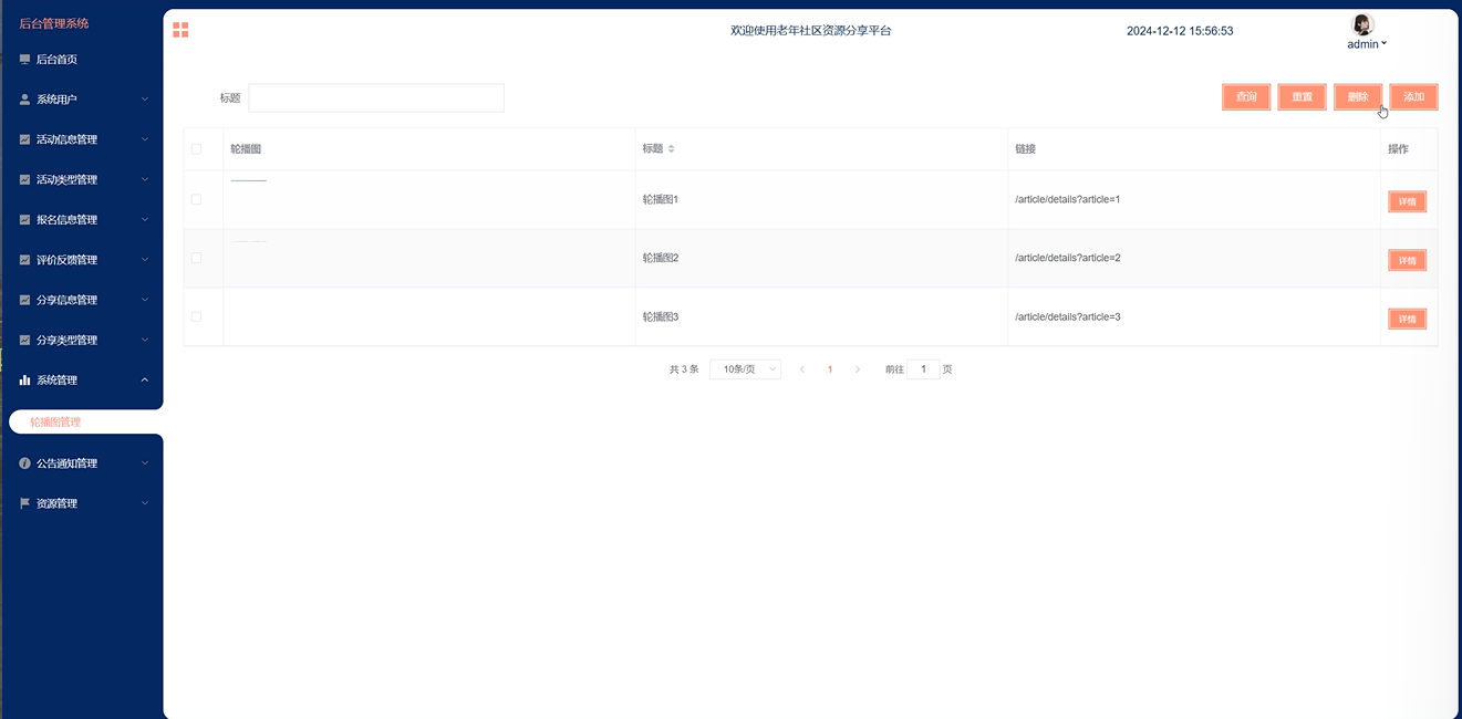 管理员点击"系统管理-轮播图管理"菜单,可以对前台展示的轮播图进行设置,界面如下图5-18所示。