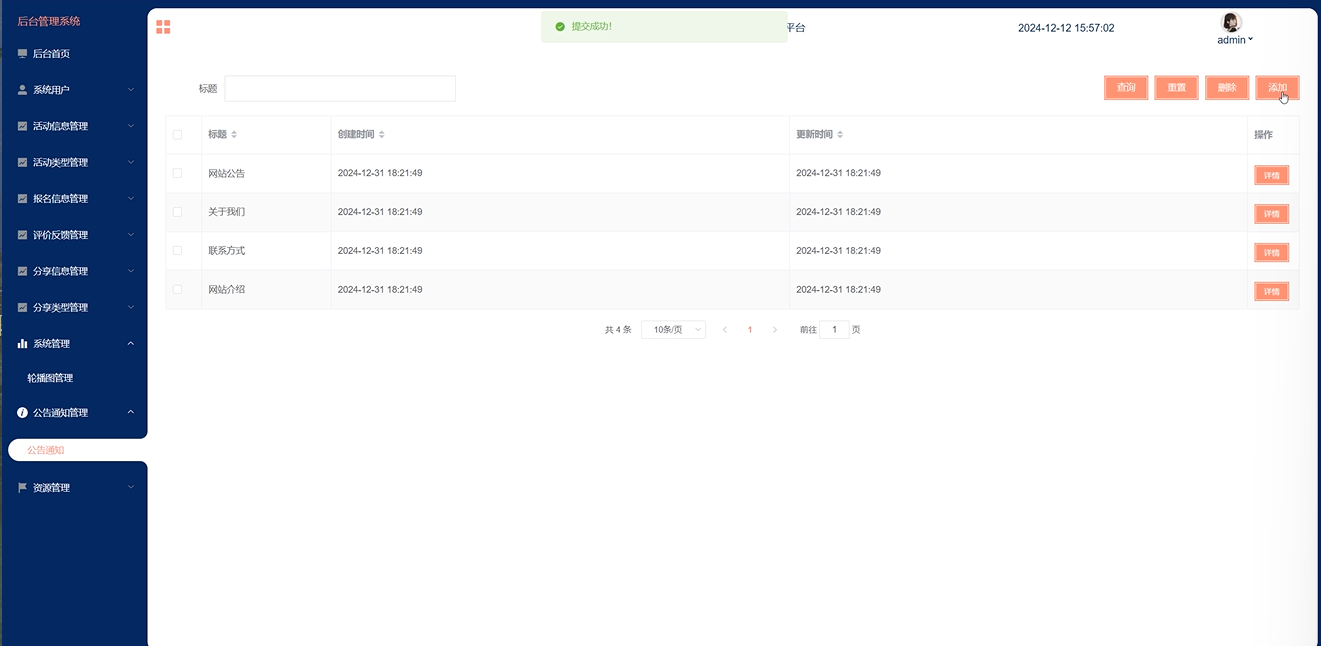 管理员点击"公告通知管理"这个菜单,可以对系统中的公告通知进行管理,包括公告通知的增删改查等操作。公告通知管理界面如下图所示。