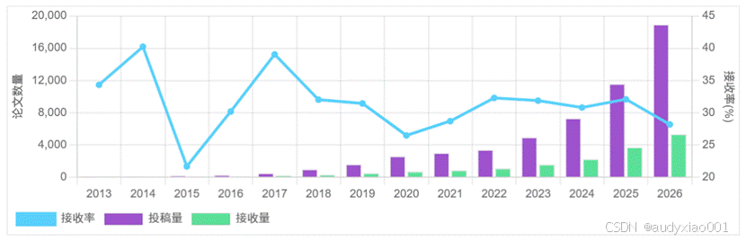 ICLR(International Conference on Learning Representations)作为机器学习领域顶会,2026年吸引全球近19000篇论文投稿,创历史新高。如图1所示,最终录用率仅28.18%,平均得分5.39,最高分8.5,均为近三年最低水平,反映出投稿竞争加剧与评审标准趋严。会议将于2026年4月23日-27日在巴西举办,议题覆盖大语言模型、扩散生成、强化学习、多模态融合等前沿方向,同时还关注AI安全、垂直领域应用等研究主题。