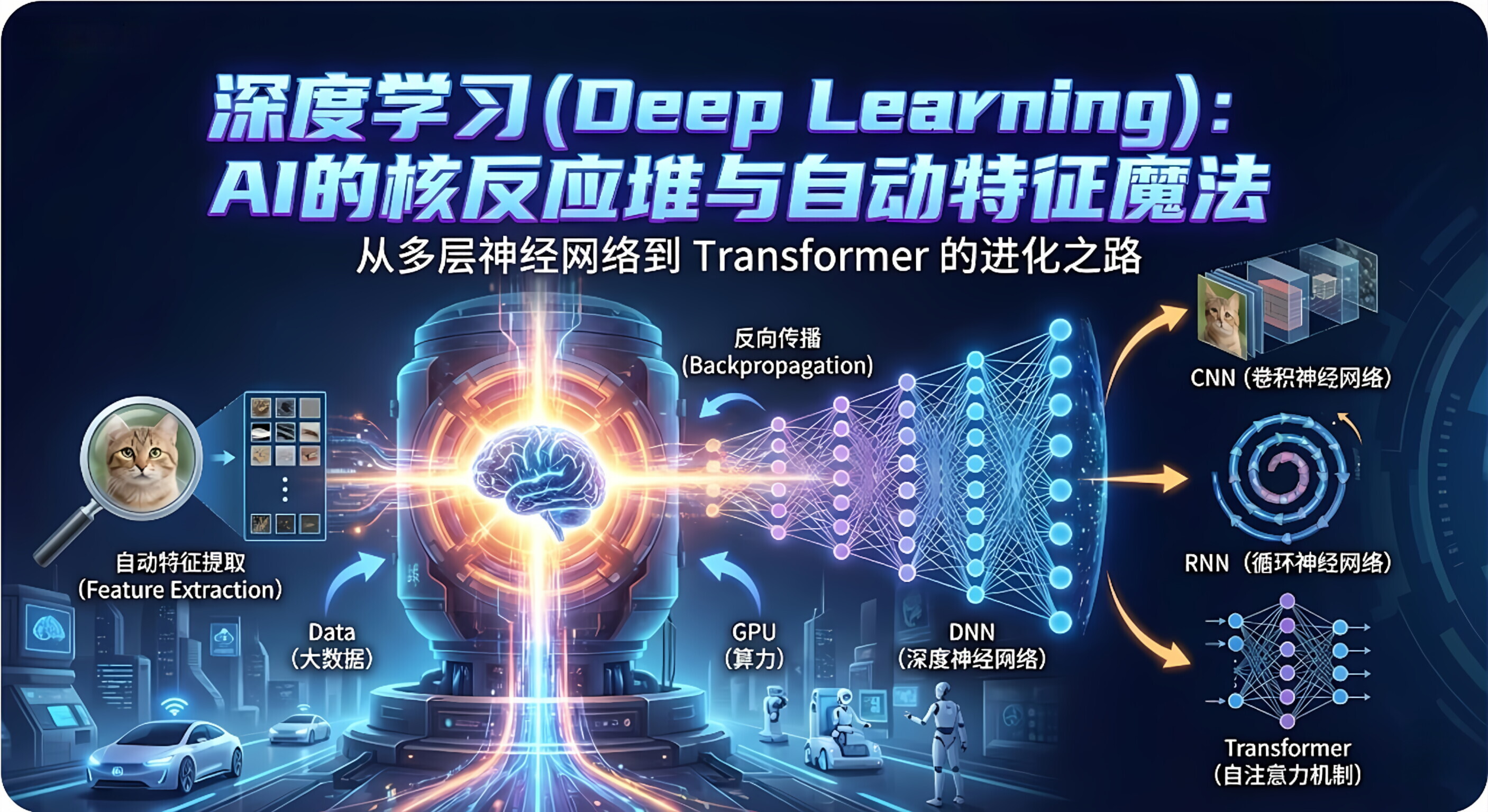 它不再需要人类手把手教它"什么是猫",而是通过模拟大脑的神经网络,在海量数据中自我进化,自动提炼出理解世界的抽象规律。它是 AlphaGo 战胜柯洁、ChatGPT 通过图灵测试背后的真正功臣。