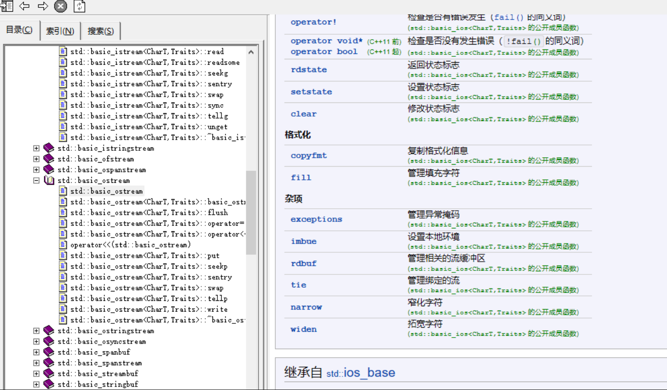 - ios类是istream类和ostream类的虚基类,用来提供对流进行格式化I/O操作和错误处理的成员函数