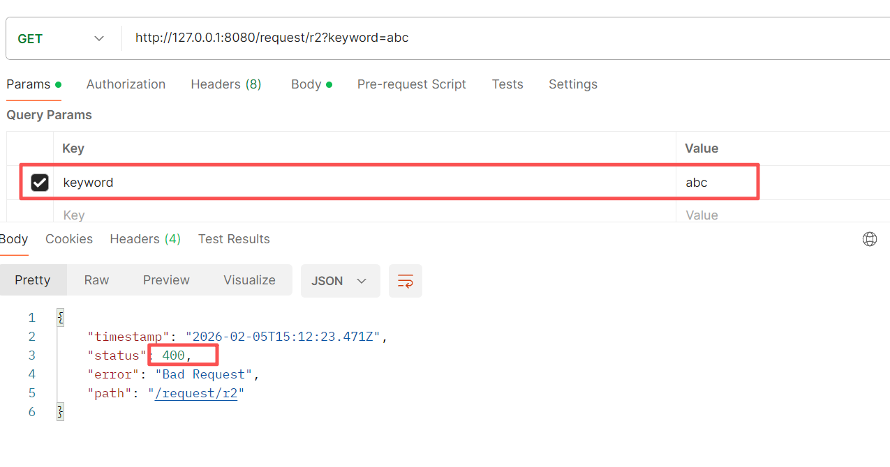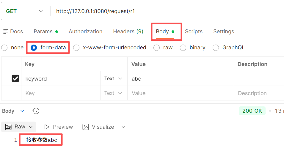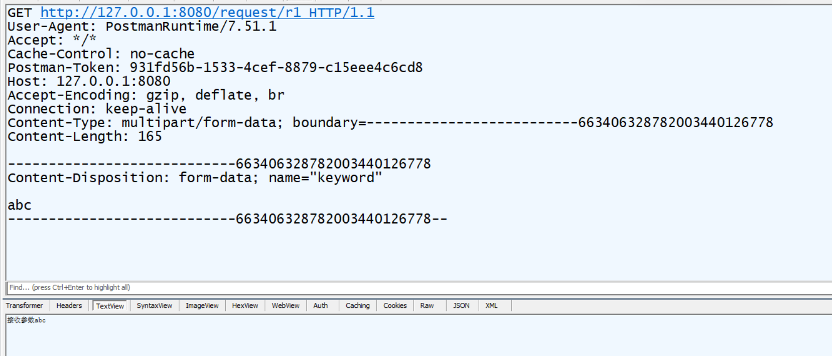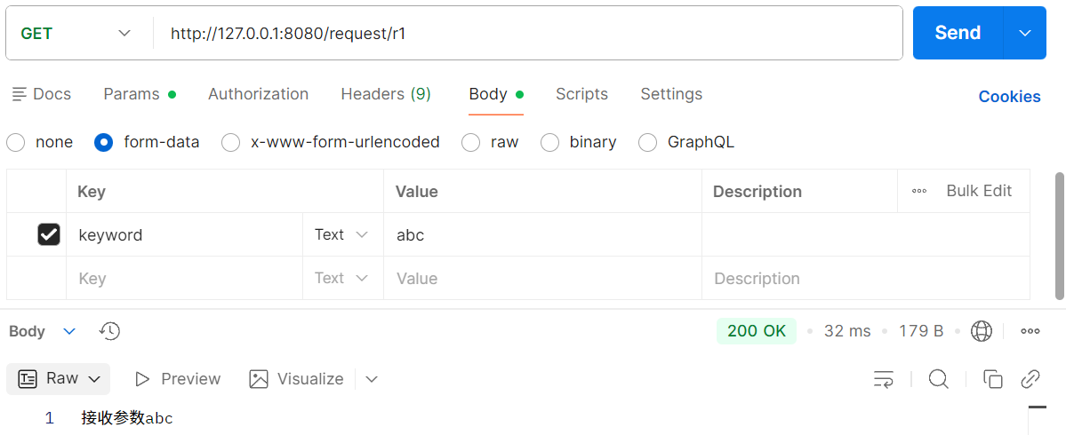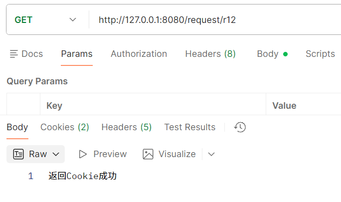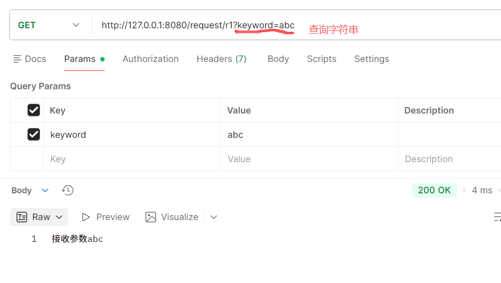 使用 postman 发送请求并传参http://127.0.0.1:8080/request/r6?key=abc