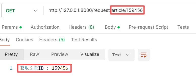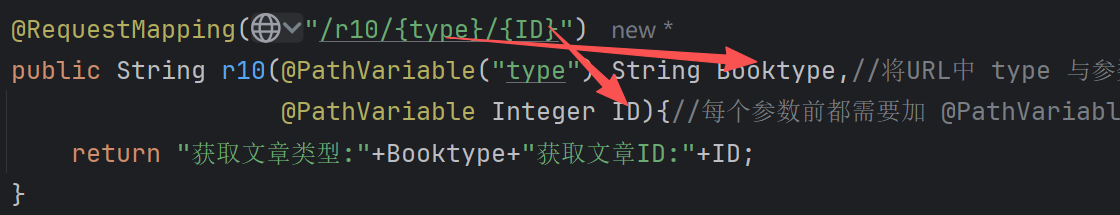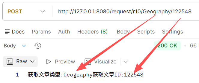 java//获取URL 中参数 @RequestMapping("/r10/{type}/{ID}") public String r10(@PathVariable("type") String Booktype,//将URL中 type 与参数 Booktype 进行绑定 @PathVariable Integer ID){//每个参数前都需要加 @PathVariable return "获取文章类型:"+Booktype+"获取文章ID:"+ID; }使用 postman 发送请求http://127.0.0.1:8080/request/r10/Geography/122548