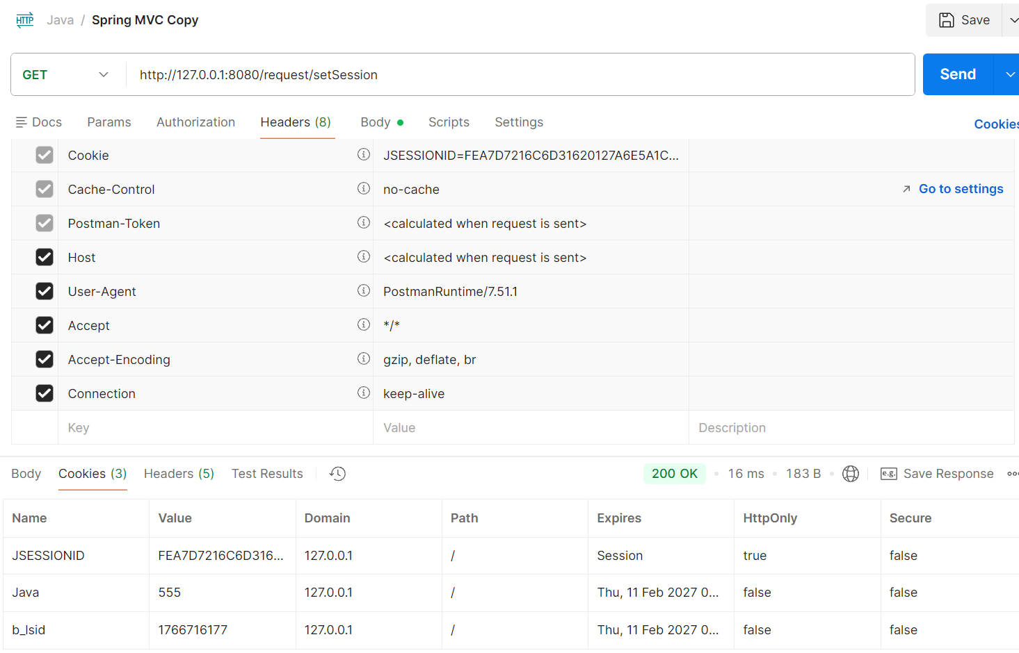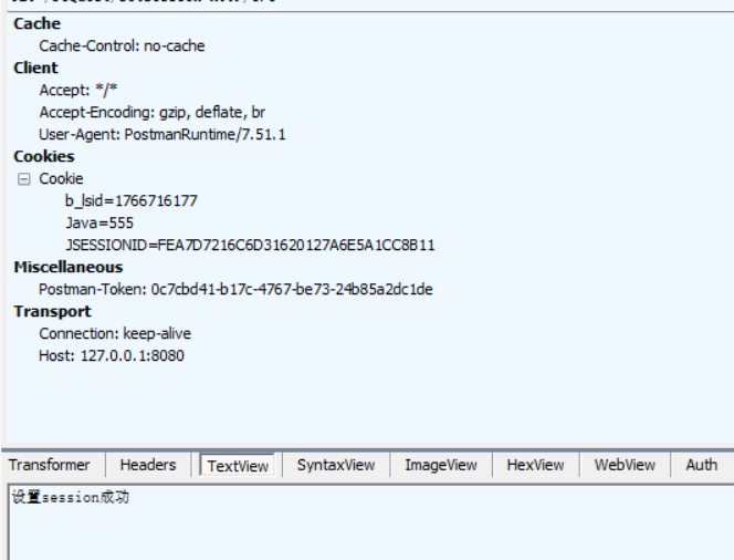 java//存储Session @RequestMapping("/setSession") public String setSession(HttpServletRequest request){ //从cookie中获取sessionID , 根据sessionID 获取session对象 //如果sessionID不存在 , 则创建 HttpSession session = request.getSession(); //默认存储在内存中 //登录的用户名称 session.setAttribute("userName","zhangsan"); session.setAttribute("age",17); return "设置session成功"; }使用 Postman 来发送请求http://127.0.0.1:8080/request/setSession