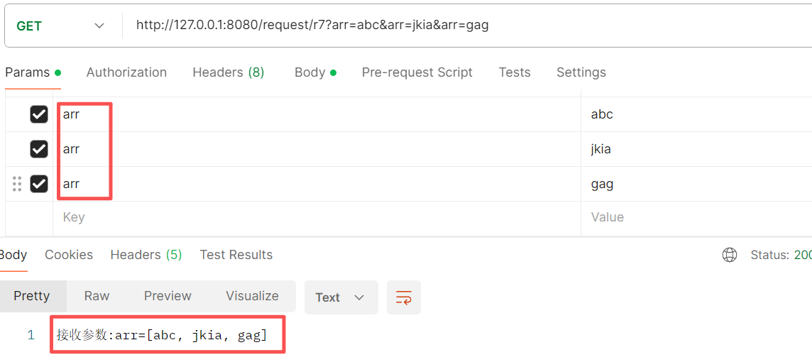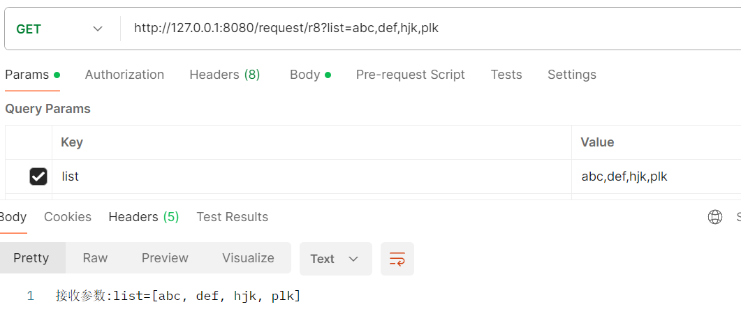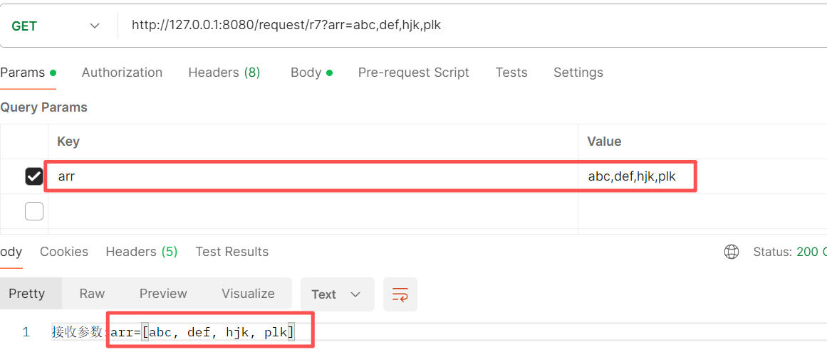 使用 postman 发送请求并传参: http://127.0.0.1:8080/request/r7?arr=abc,def,hjk,plk