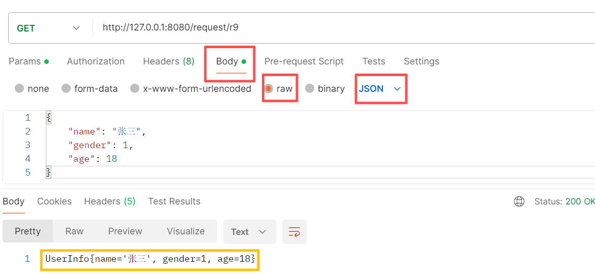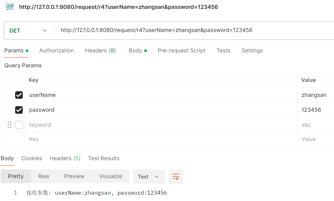 使用 postman 发送请求并传参http://127.0.0.1:8080/request/r5?name=zhansan&gender=1&age=18