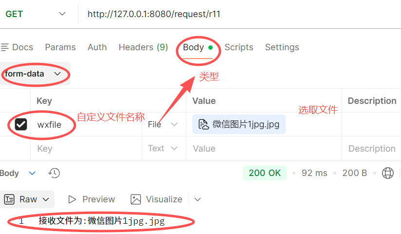 java//上传文件 @RequestMapping("/r11") public String r11(@RequestParam("wxfile") MultipartFile file) throws IOException { //获取从前端上传的原始文件名 String filename = file.getOriginalFilename(); //直接将内存中的文件流写入本地指定目录 file.transferTo(new File("D:/Temp/"+filename)); return "接收文件为:"+filename; }使用 POSTMAN 发送请求 : http://127.0.0.1:8080/request/r11