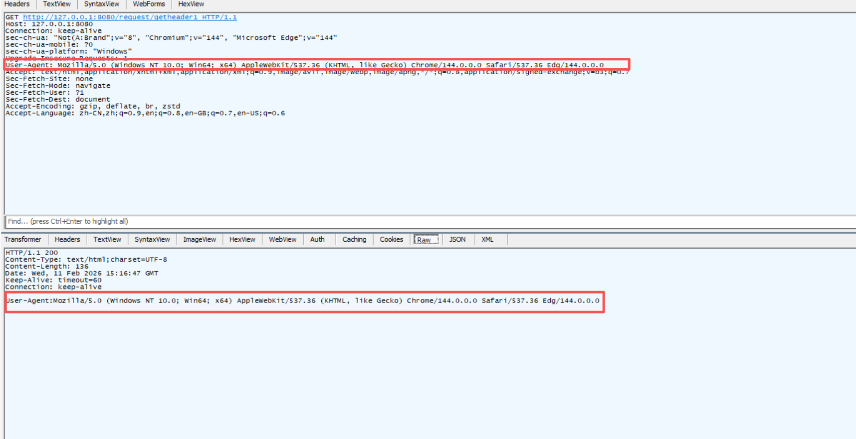 java//获取Header @RequestMapping("/getheader1") public String getheader1(HttpServletRequest request){ String UserAgent = request.getHeader("User-Agent"); return "User-Agent:"+UserAgent; }