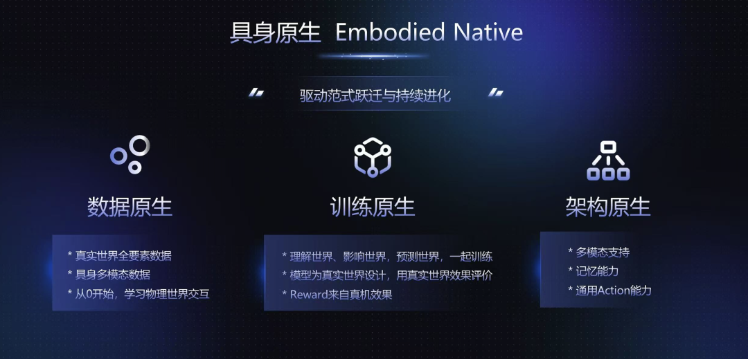 区别于互联网原生,具身原生是****从第一行代码就为机器人而写,从一开始就教模型理解物理世界,****而非改造现有大模型。