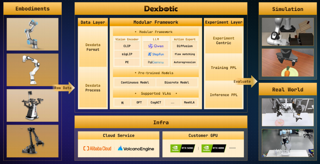 光有模型还不够,原力灵机还发布了 Dexbotic 2.0 开发框架。这是一个让所有开发者都能快速使用的开源具身原生框架。