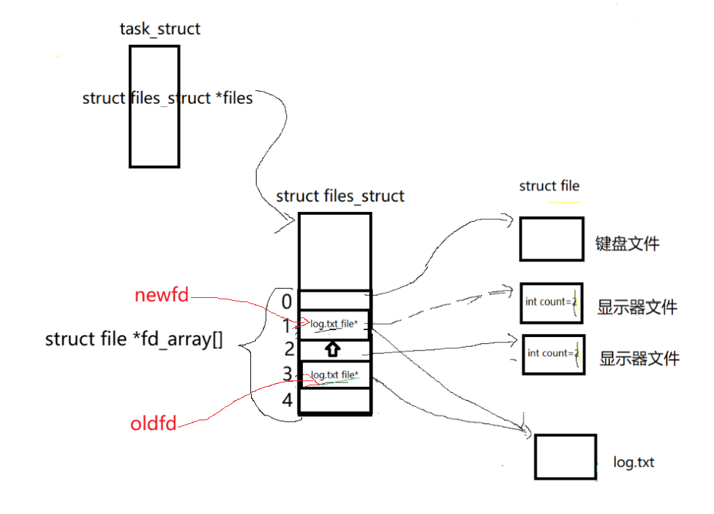 **对文件描述符的理解:**在进程中每打开一个文件,都会创建有相应的文件描述信息struct file,这个描述信息被添加在pcb的struct files_struct中,以数组的形式进行管理,随即向用户返回数组的下标作为文件描述符,用于操作文件。