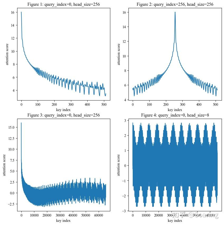 这里的远程衰减是统计学意义上的, 并不是严格的数学证明. 也就是说对于大多数随机的q, k, 相对距离较远的两个token之间的分数会比相对距离较远的两个token之间的分数大. 因此呈现震荡衰减的特性: