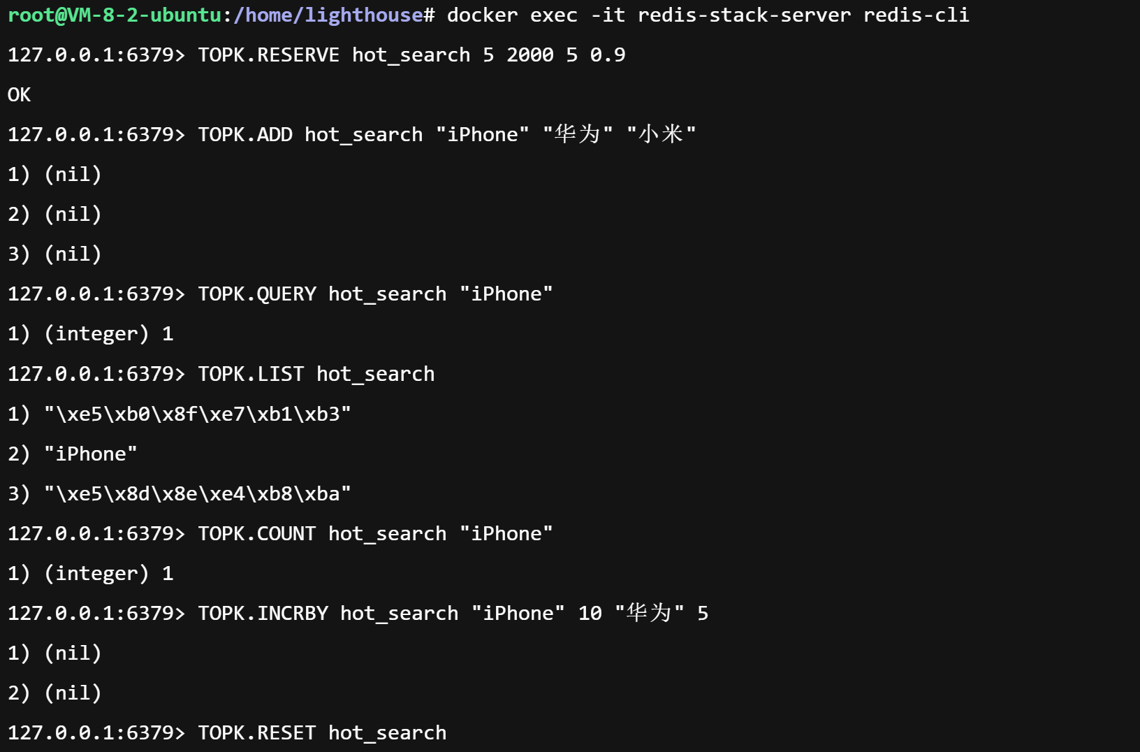 // 执行 TOPK.INCRBY hot_search "iPhone" 10 "华为" 5 "小米" 3
