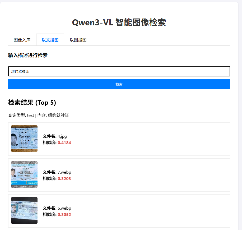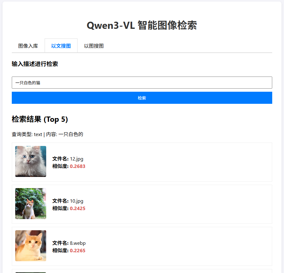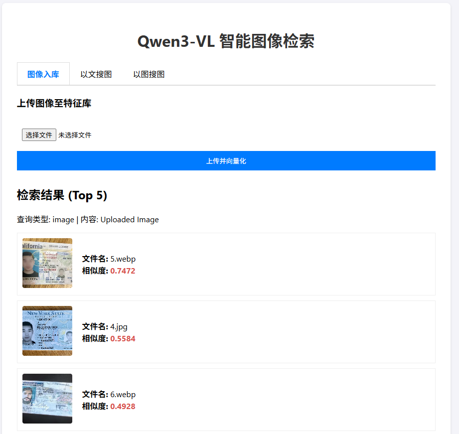 - 多模态检索:支持"以文搜图"和"以图搜图",实时计算查询向量并在库中进行相似度匹配。