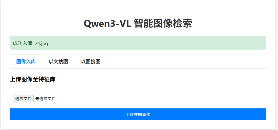 - 在"图像入库"标签页,上传若干张测试图片(例如:猫、汽车、文档截图等)。