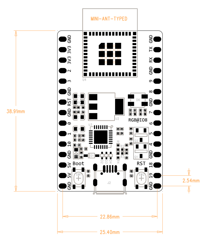 ESP32-C3-MINI-1模组集成了ESP32-C3芯片、4MB嵌入式Flash以及PCB板载天线,Flash直接封装在芯片中,使得模组的尺寸非常小巧,也让整个开发板的布局更加紧凑。这款芯片采用RISC-V 32位单核处理器,主频最高可达160MHz,虽然是单核,但对于入门开发、简单的物联网项目来说,完全够用------无论是跑简单的GPIO控制、串口通信,还是运行WiFi、蓝牙相关的程序,都能轻松应对。